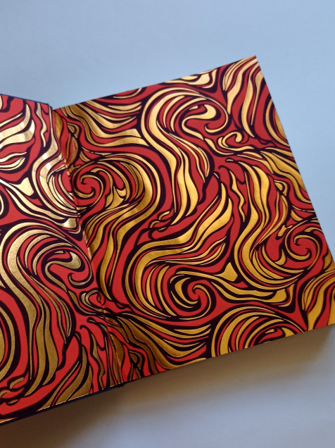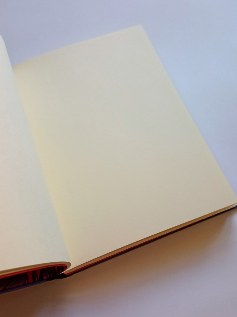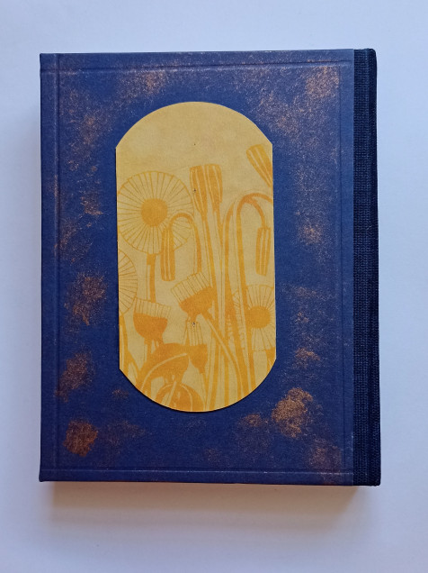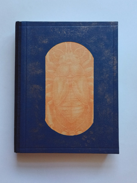 Libreta de tapa dura con imagen de escarabajo y plantas revelada con técnica de antotipia (revelado al sol con pigmentos naturales) y decoraciones con pintura dorada y tapas