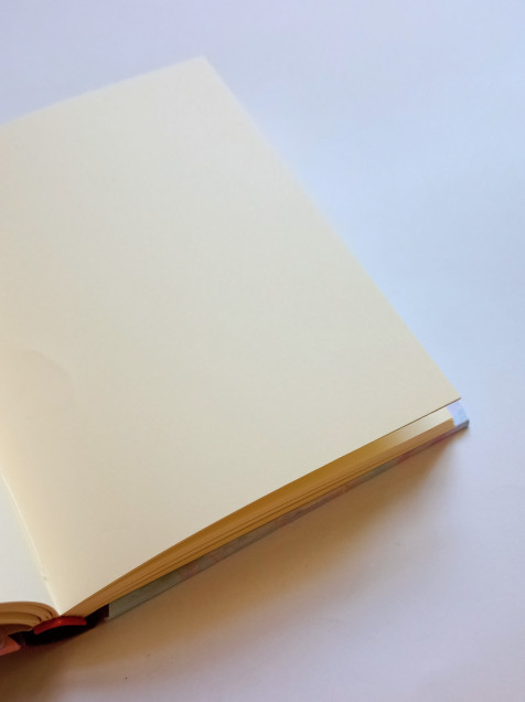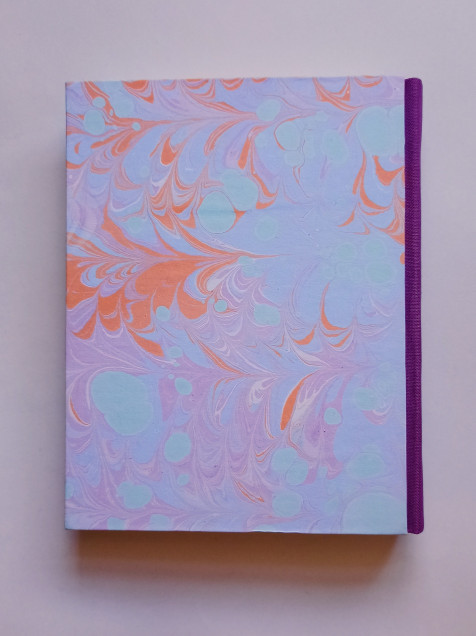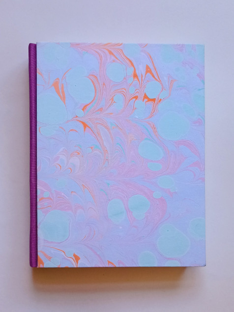 Libreta de tapa dura, estructura Bradel, con papel marmoleado original en la portada