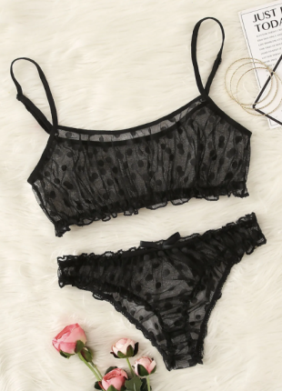 Conjunto de lencería de sostén y braga con malla de lunares y ribete de volantes