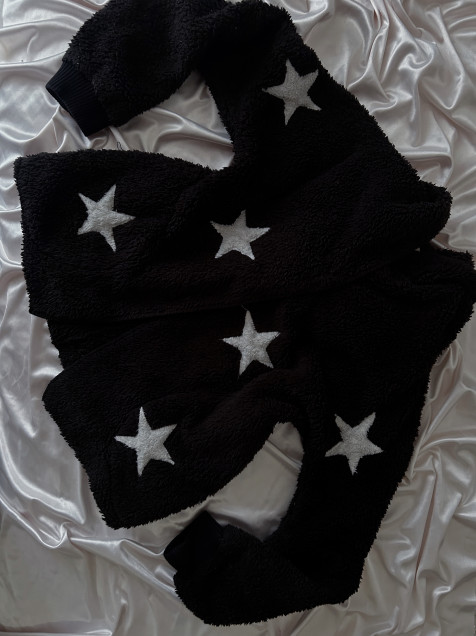 Cárdigan negro afelpado de textura ultra suave con aplicación de estrellas blancas al frente y mangas.