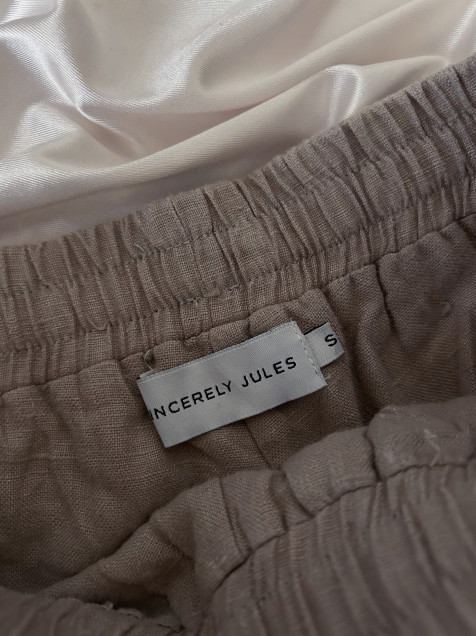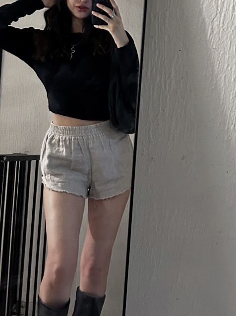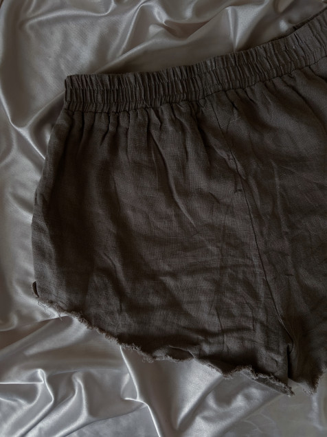 Short beige de lino con cintura elástica que combina comodidad y elegancia natural.