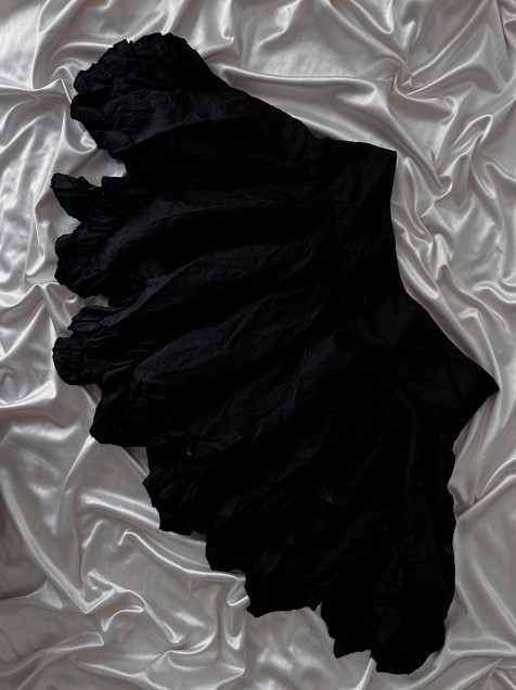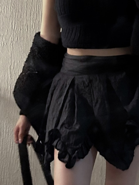 Falda negra corta con terminación irregular que aporta movimiento y carácter.
