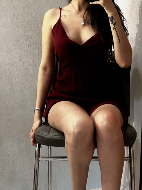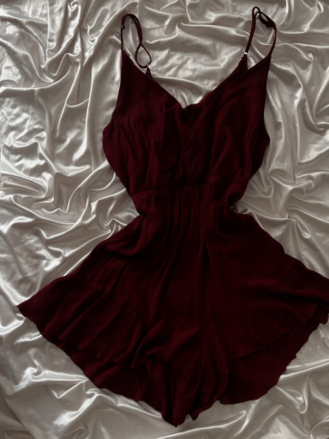 Romper corto en tono vino con tirantes delgados y escote en V que estiliza el busto. Su tela ligera y caída suave lo hacen perfecto para un look fresco pero elegante. El corte relajado en la parte inferior da comodidad y movimiento, ideal para días cálidos, salidas casuales o un look effortless con sandalias o tacones.