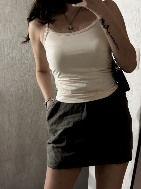 Top blanco de tirantes delgados con escote suave y corte ajustado que se adapta al cuerpo. Su diseño minimalista lo convierte en una prenda esencial para cualquier outfit: perfecto para combinar con faldas, jeans o shorts y crear looks frescos y versátiles.