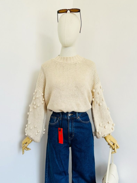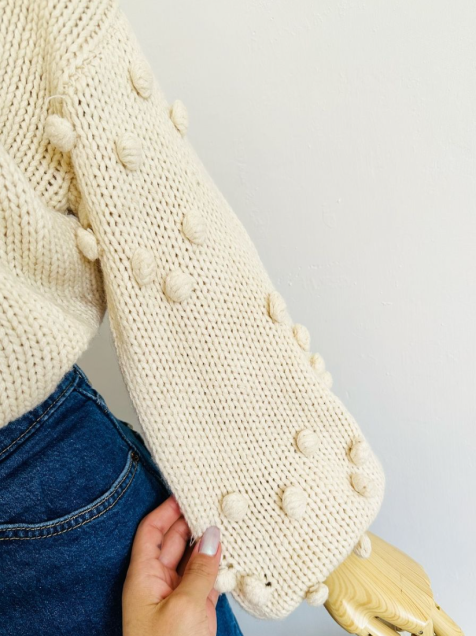 hermoso suéter de punto crema con mangas de globo en 3D, súper lindo