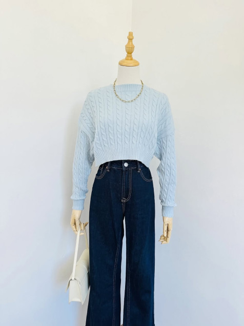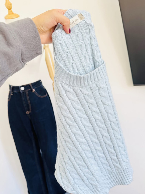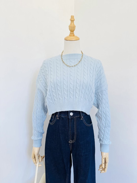suéter crop color azul cielo, tejido de grecas, súper suave