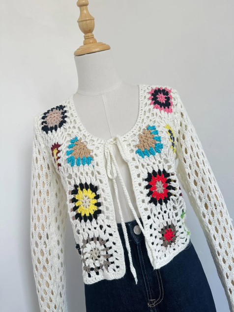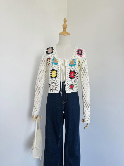 Blusa crochet con bordado de flores, se ajusta de la parte frontal
