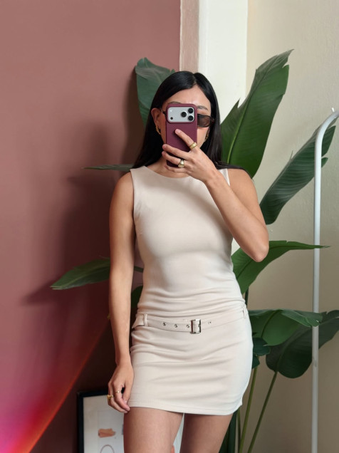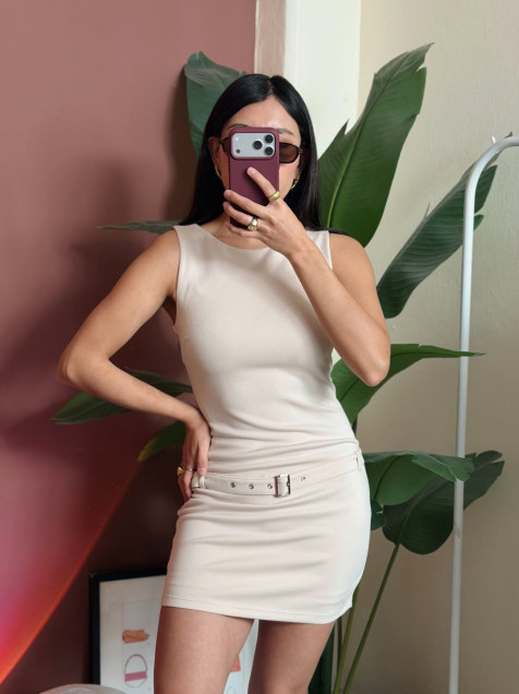 Vestido entallado color beige, tiene cinturón incluido y la espalda un poco más descubierta