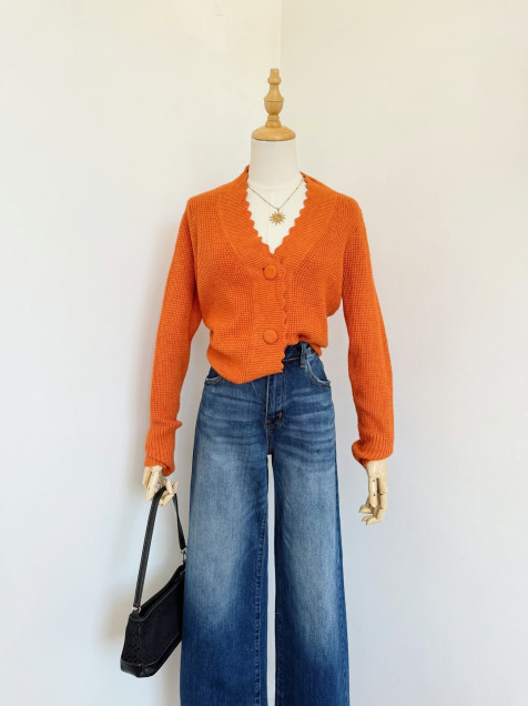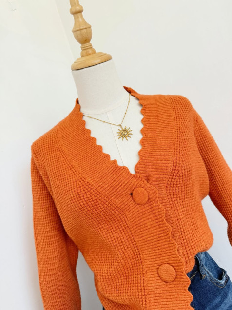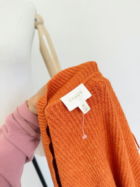 Cardigan de punto color naranjita, en la foto se ve más encendido el color, pero el tono en persona es un poco más bajo, tiene botones funcionales