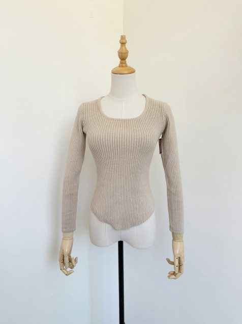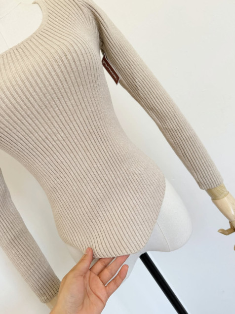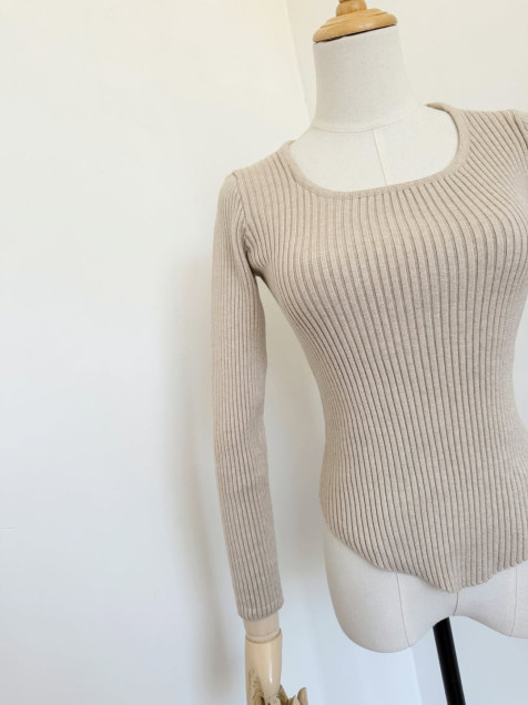 Blusa de punto color beige, tejido grueso, ajusta al cuerpo
