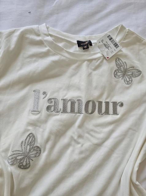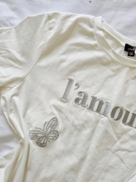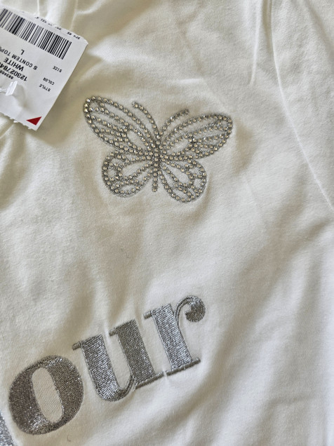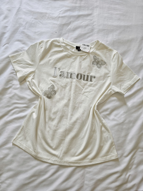 Blusa corte básico con bordado y apliques en plateado ☆ Talla G