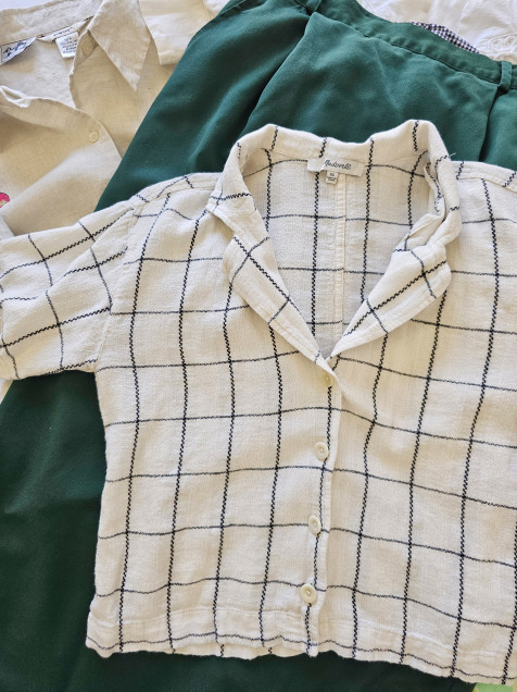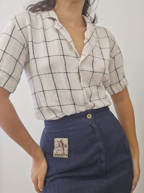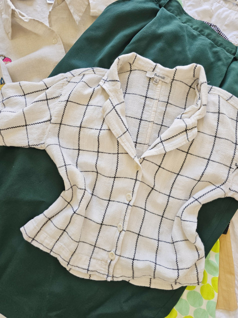 Camisa cropped, blanca a cuadros en negro, corte holgado ☆ Talla Xs (queda a S por el corte)
