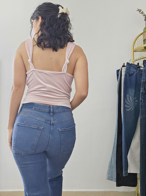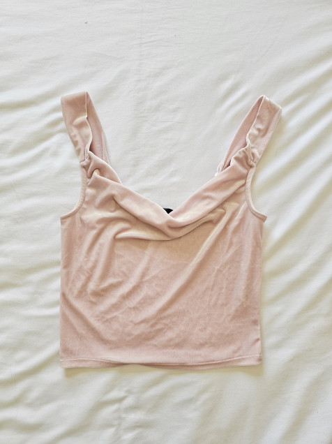 Blusa de tirantes, escote caído, tela velvet color rosa pastel ☆ Talla S