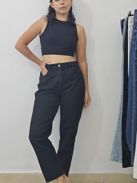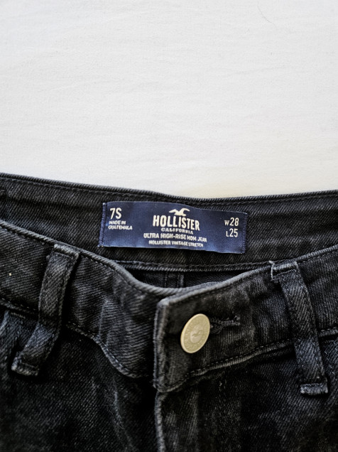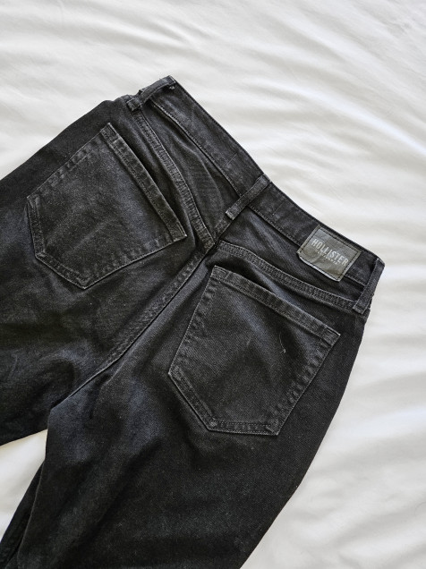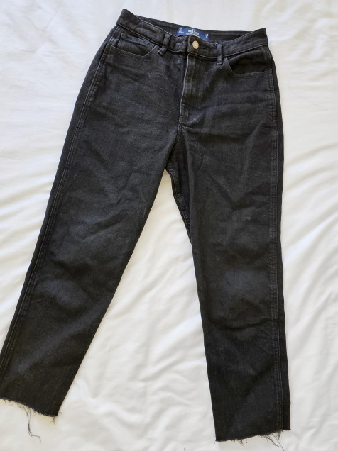 Mom jeans color negro, efecto deshilachado en la parte de abajo, marca Hollister ☆ Talla 7