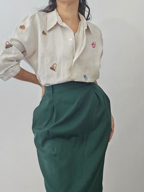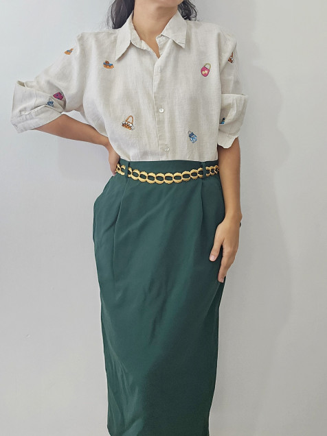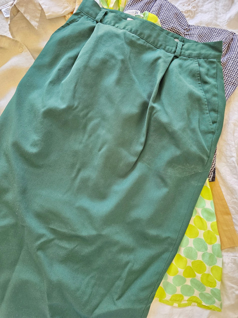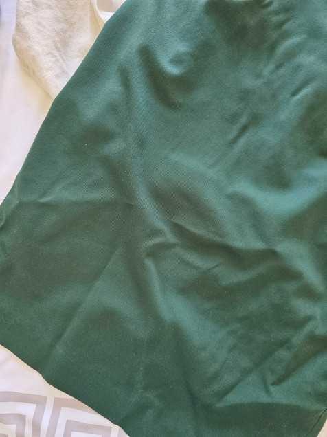 Falda midi color verde, tiene bolsillos y fondo, no transparenta nada, tiene una mancha o decoloración sutil ☆ Talla 12 ( G )