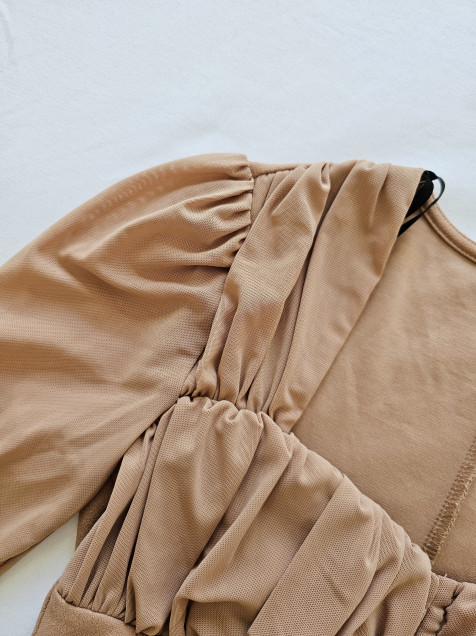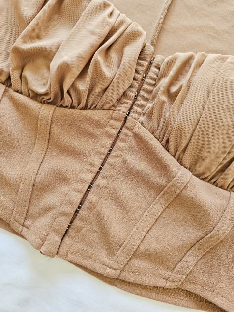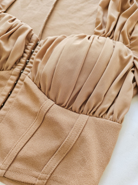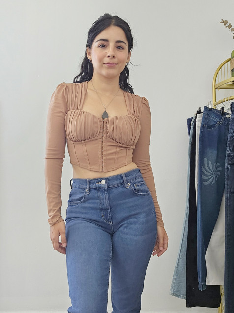 Blusa estilo corsé, de manga larga de mesh, se abrocha con ganchitos al frente ☆ Talla S