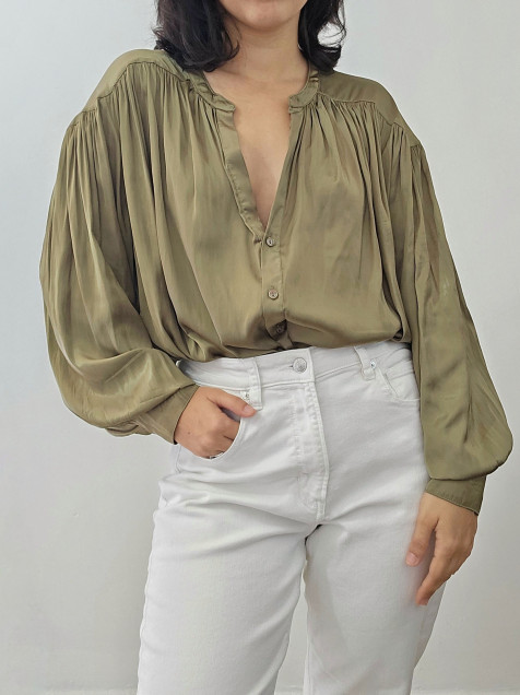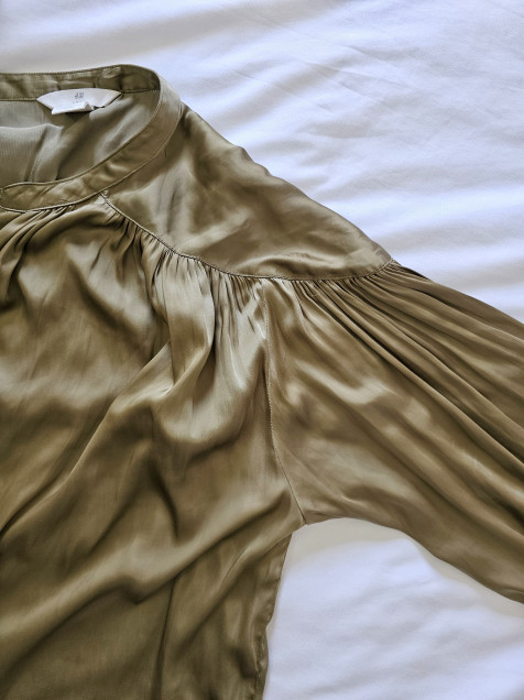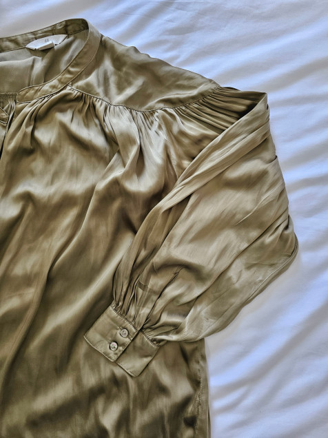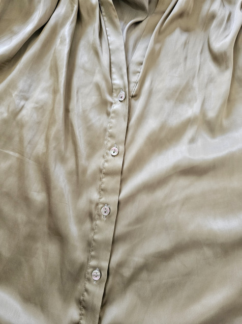 Camisa satinada, color verde olivo, manga amplia, marca H&M ☆ Talla 6 ( S / M )